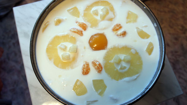 Далее слоями выкладываем фрукты и заливаем их смесью. Первый слой, второй, третий... Зависит от формы. Фрукты лучше не укладывать плотно, чтобы смесь "схватилась".